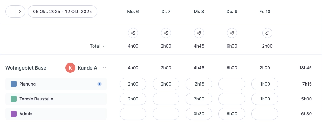 Vergleichen Sie geplante und tatsächlich geleistete Stunden in Echtzeit, um Budgetabweichungen früh zu erkennen.