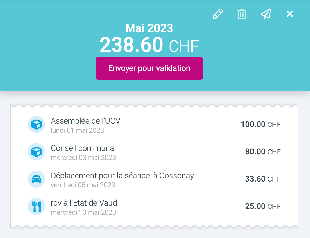 Les employés ou les conseillers peuvent directement saisir leurs dépenses dans tipee et y scanner un ticket de caisse ou renseigner un nombre de km parcourus. Il est aussi possible d’instaurer différents types de dépenses: forfaits repas, indemnités kilométriques différentes selon le type de véhicule utilisé, indemnités de représentation pour les communes, etc… et même décompter des jetons de présence pour les conseillers communaux ou municipaux.