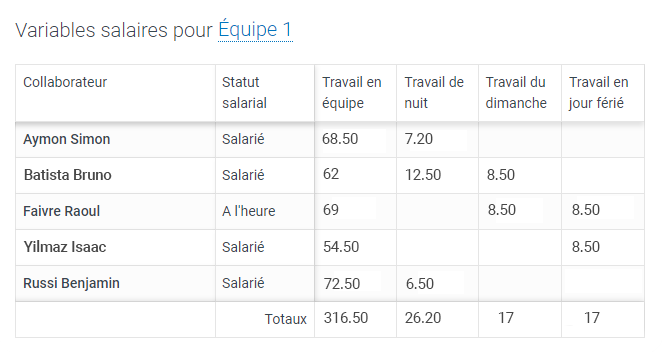 Gérez et calculez automatiquement les majorations et les indemnités salariales avec tipee. Vous pouvez facilement générer plusieurs variables salaires, tels que pour le travail en équipe, le travail de nuit, les piquets ou le travail effectué les dimanches et jours fériés.